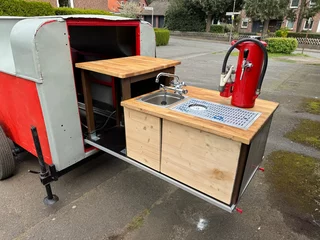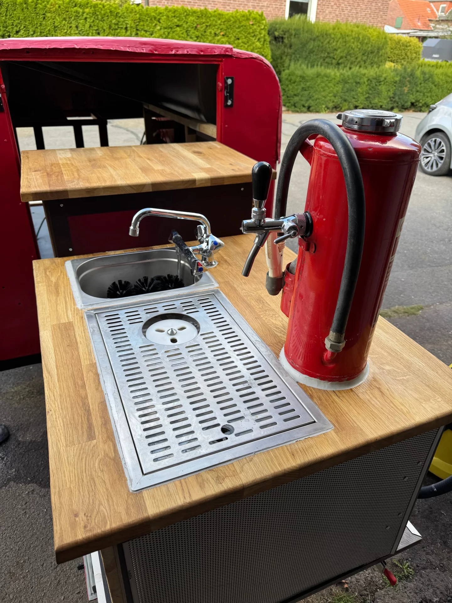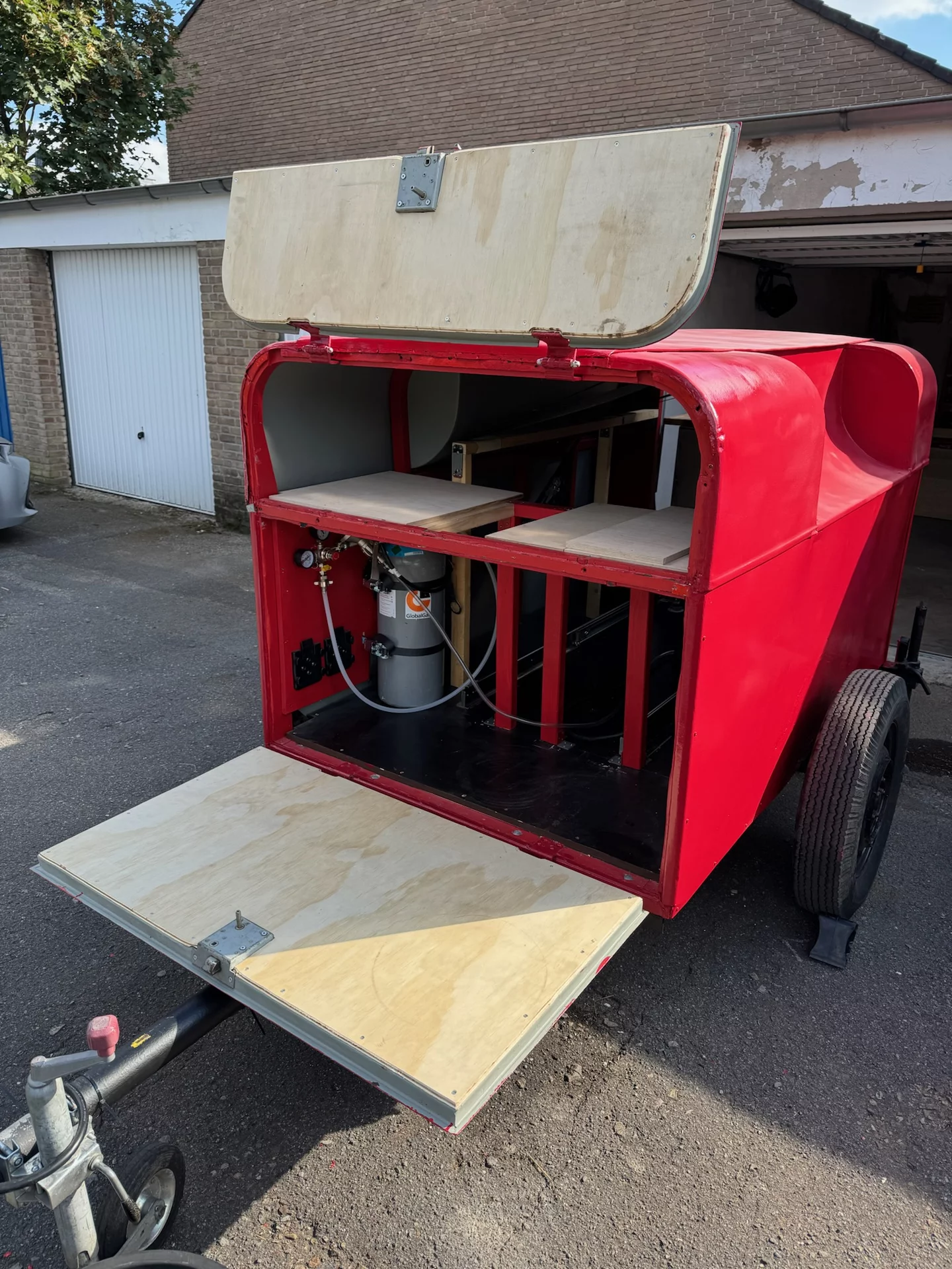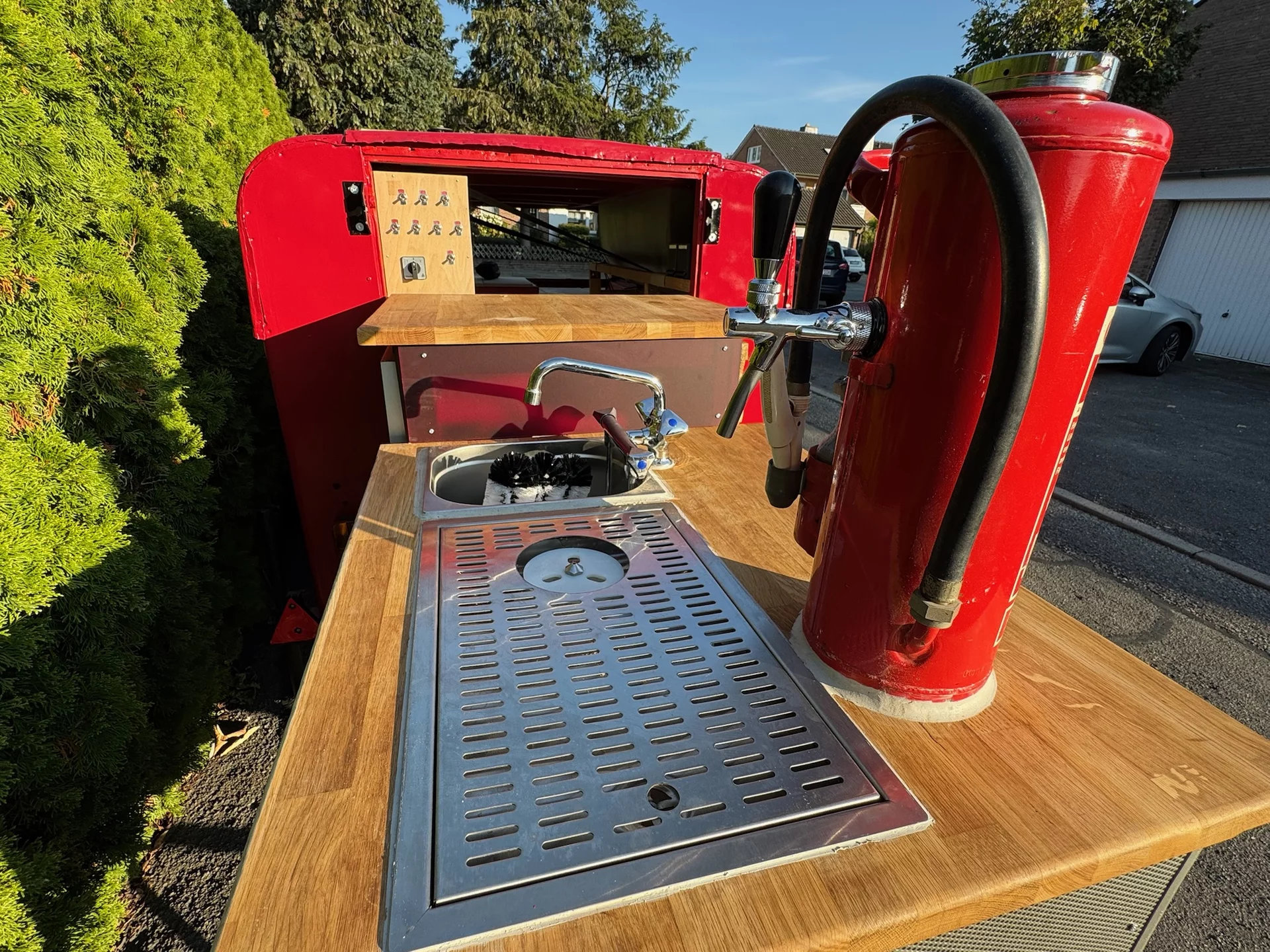 Nach und nach kamen viele kleine Dinge, wie die Halterung für die Bierfässer (die wir ganze dreimal aus- und wieder einbauen mussten, da irgendetwas nicht passte, wir an irgendetwas nicht gedacht hatten, oder sie einfach im weg war), die C02-Flasche, Spülbecken, Arbeitsplatte und nicht zuletzt der Zapfhahn dazu. Einige Dinge, wie die Türen des Auszugs noch als Prototyp, damit für die ersten Test überhaupt etwas vorhanden war. Auch im verborgenen Tat sich einiges: Abwasserablauf, Stromverkabelung, Frischwasseranschluss, Beleuchtung (der Anhänger brauchte ja auch irgendwann TÜV) und Innenraumbeleuchtung, damit man nicht im Dunkel steht - um nur einige der Dinge zu nennen.