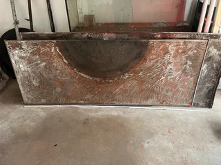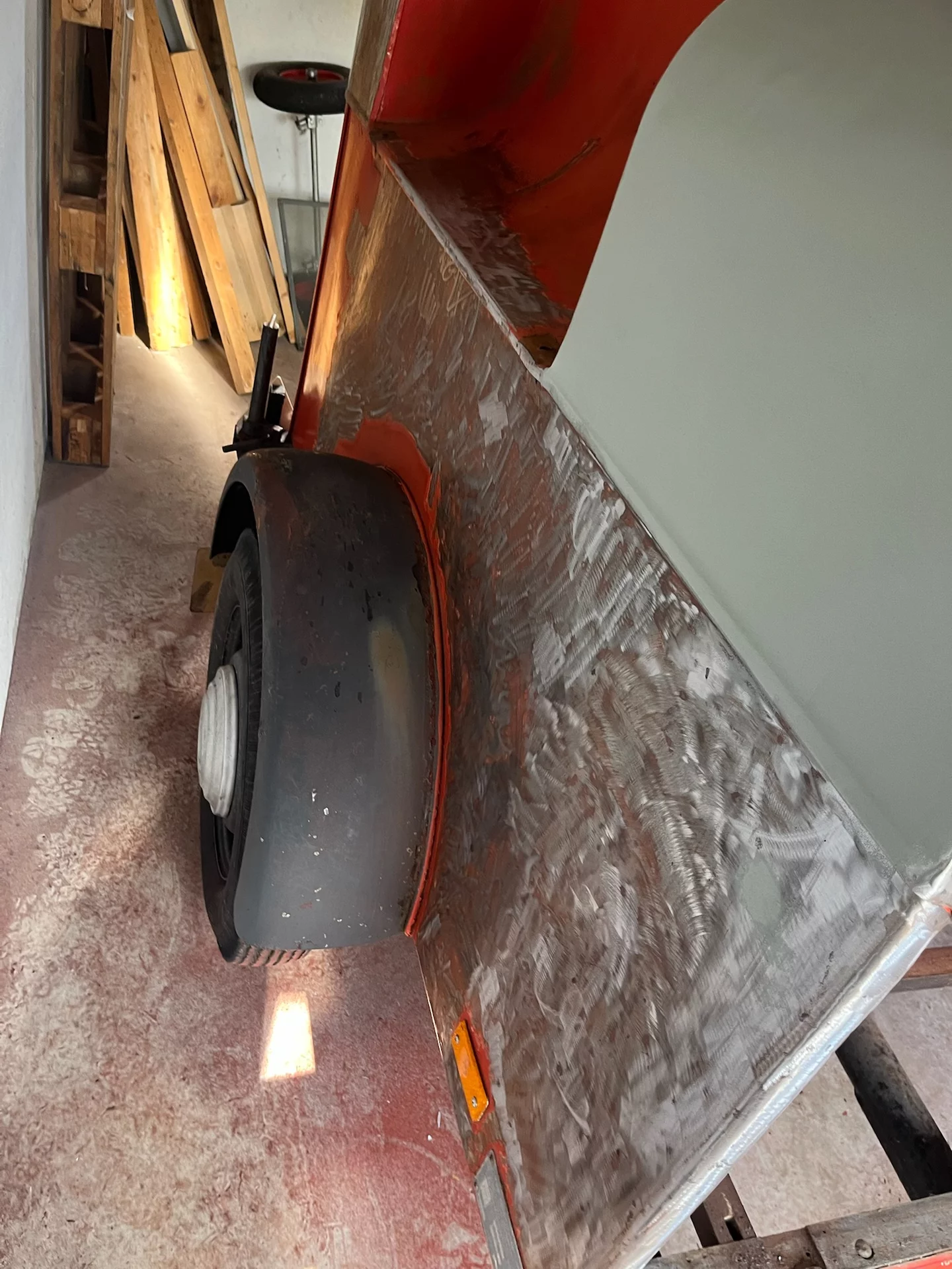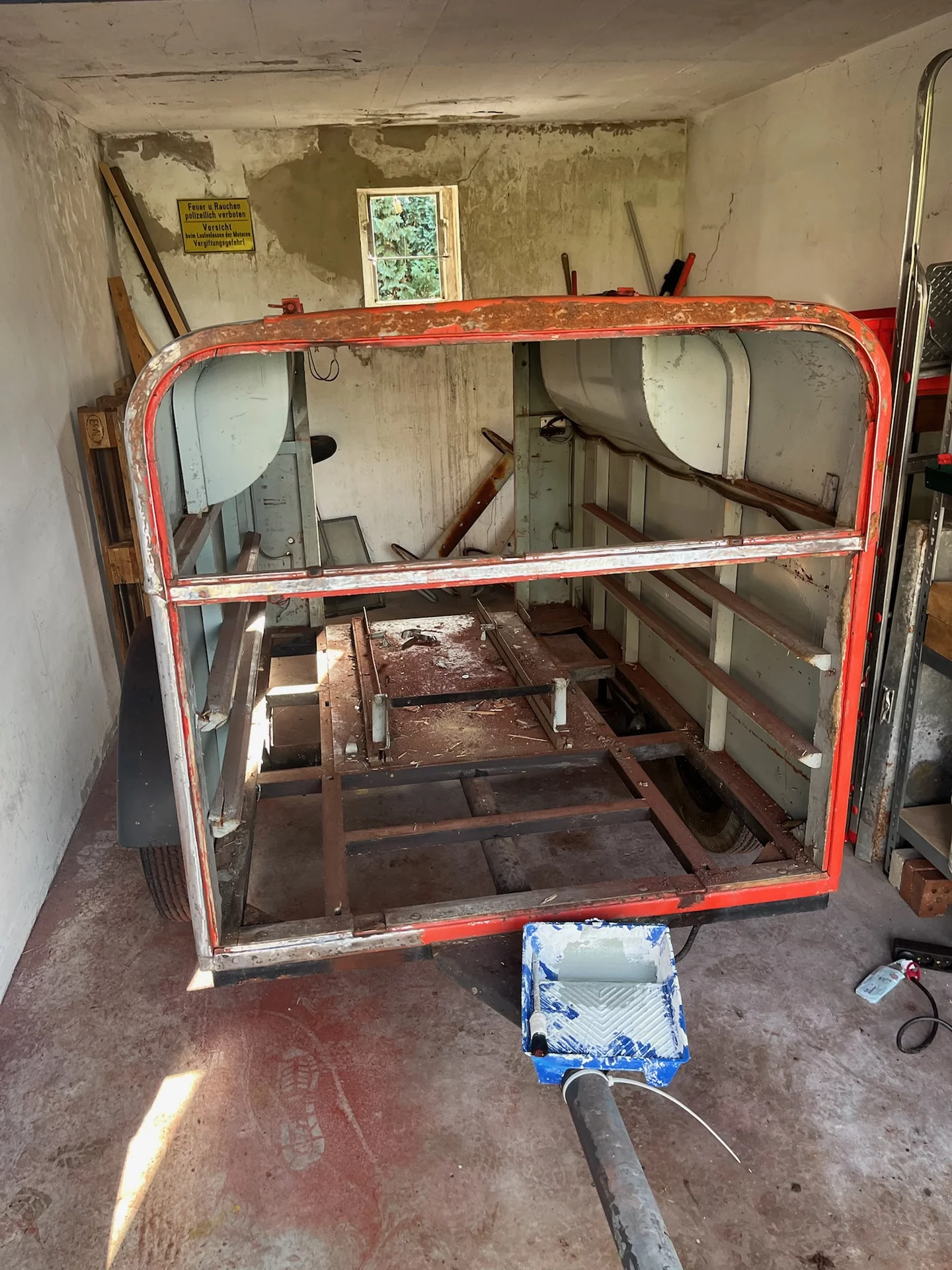 Danach hieß es dann Farbe entfernen. Da doch die ein oder andere Roststelle zu entdecken war, musste neue Farbe drauf und vorher die alte runter. Geplant war nur außen, bis ich (Simon) eines vormittags Leander anrief und sagte: "Das kann hier alles nicht so bleiben, die Außenhaut muss runter". Nun war der Anhänger also nackig, die Farbe aber immer noch auf dem Metall. An dieser Stelle wäre es Rückblickend vermutlich einfacher gewesen einfach eine gänzlich neue Außenhaut zu bauen und die alte zu entsorgen, aber wir dachten uns, den Lack schleifen wir einfach "mal eben" mit der Flex runter. Das hat leider gar nicht so gut und schon gar nicht "mal eben" geklappt. So kam es, dass die Teile, nachdem kein Sandstrahler sie haben wollte und Leanders eigene Versuche kläglich scheiterten, zum Abbeizen gingen. Die zeitlichen Dimensionen lassen sich hier nur schwer darstellen, aber bereits durch die Entscheidung den Anhänger in alle Einzelteile zu zerlegen und der Tatsache das der DDR-Lack sein Herkunftsland bei weitem überlebt hat, lagen wir nun schon deutlich hinter unserem Zeitplan.